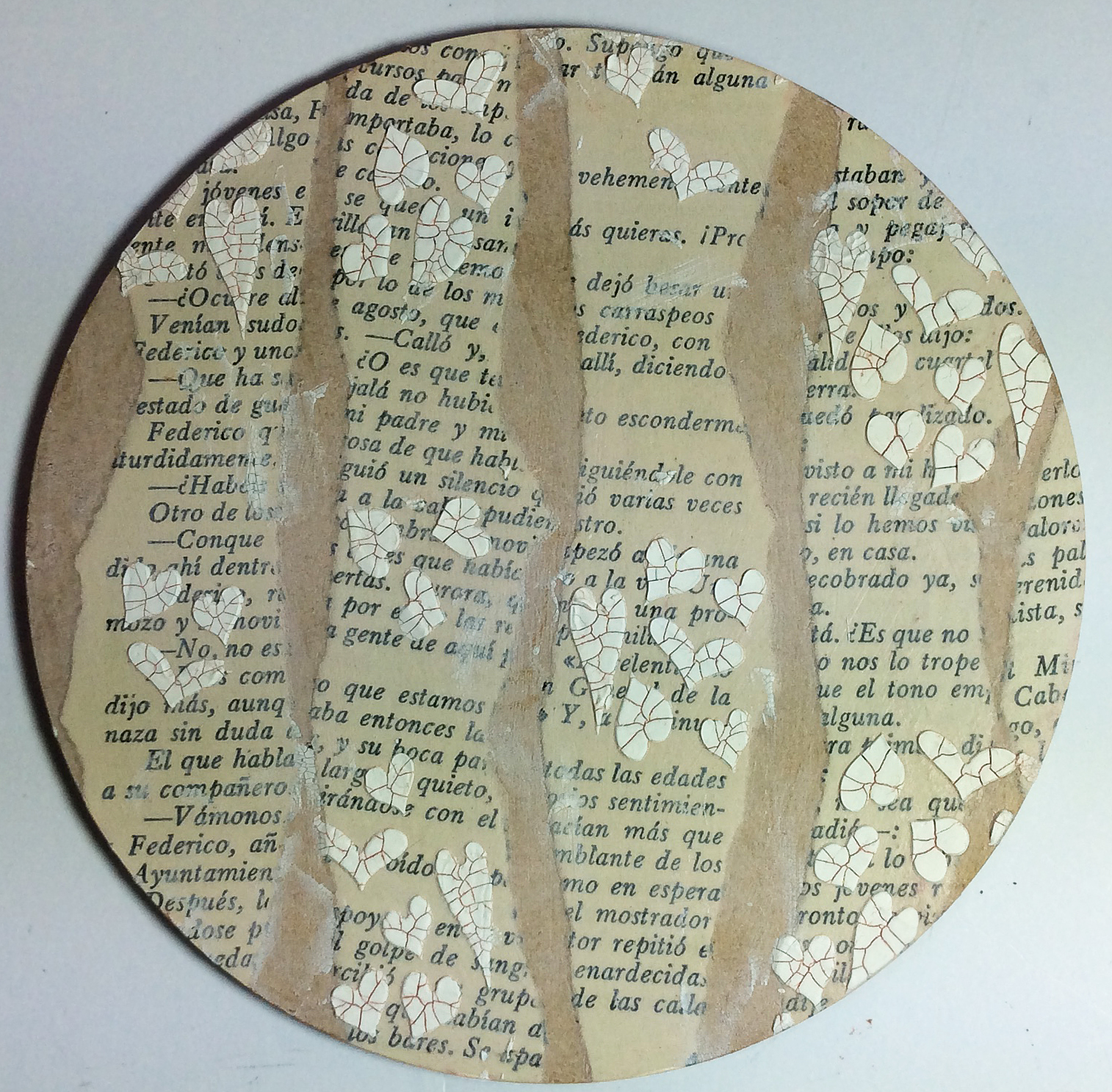 I ripped book pages into strips and glued in place with Mod Podge and applied crackle paste through my mini heart stencil. Once dry I sprayed over with Antiqued Bronze Distress Stain and wiped back with a baby wipe, to highlight the crackles.