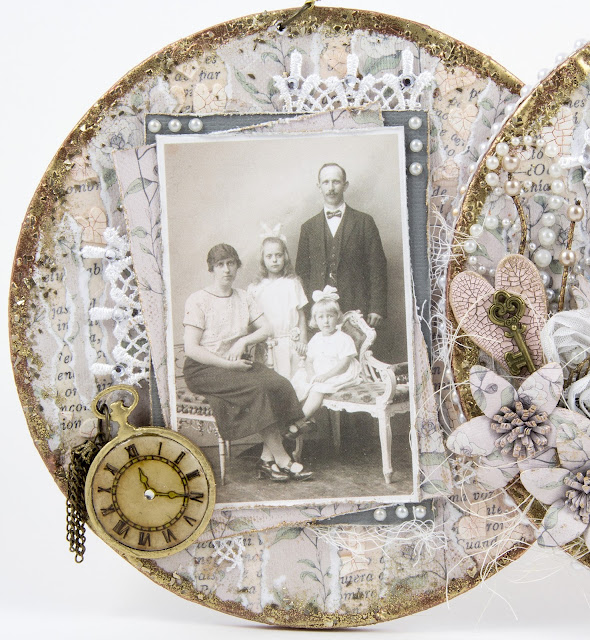 I tattered layers and built up my frames for my images adding in lace, pearls and cheesecloth.